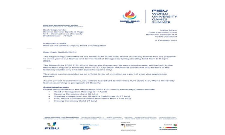 The Organizing Committee of Rhine-Ruhr 2025 has extended an official invitation to Dr. Dash, recognizing his leadership in advancing university sports in India and enhancing the nation’s presence on the global stage.