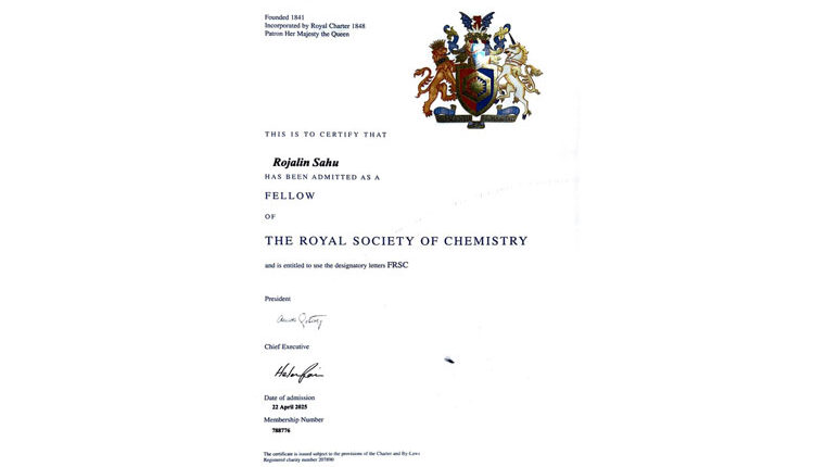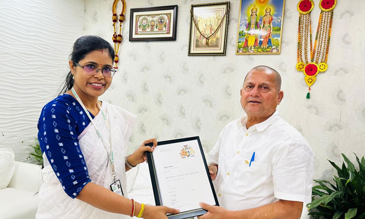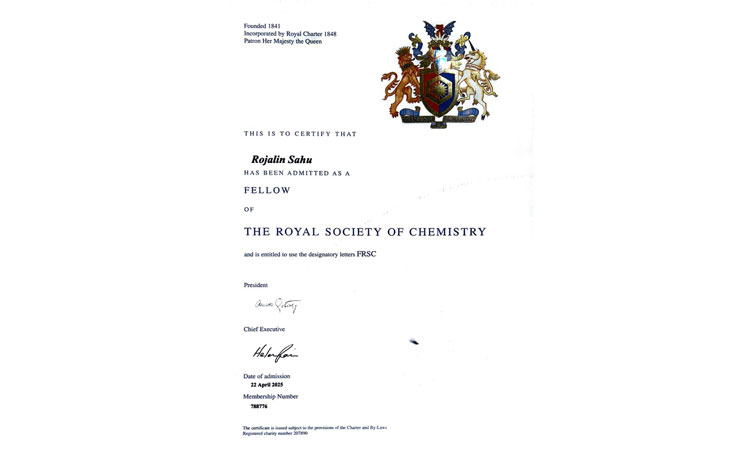 Prof. Rojalin Sahu, a distinguished academician from KIIT Deemed to be University, has been honoured with the prestigious title of Fellow of the Royal Society of Chemistry (FRSC), United Kingdom, in recognition of her outstanding contributions to materials science research. Prof. Sahu serves as Associate Dean of the Central Research Centre, Member of the KIIT Central R&D Committee, Professor in the Department of Chemistry at KIIT School of Applied Sciences, and Convener of the KIIT Cell for Women Safety.