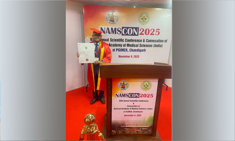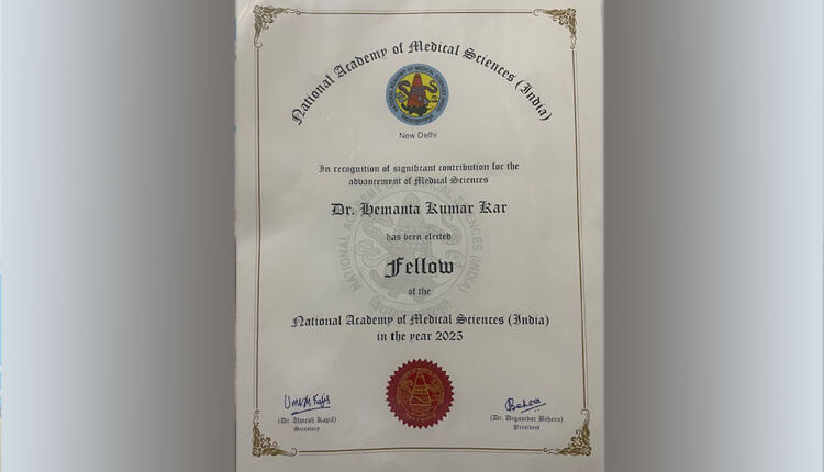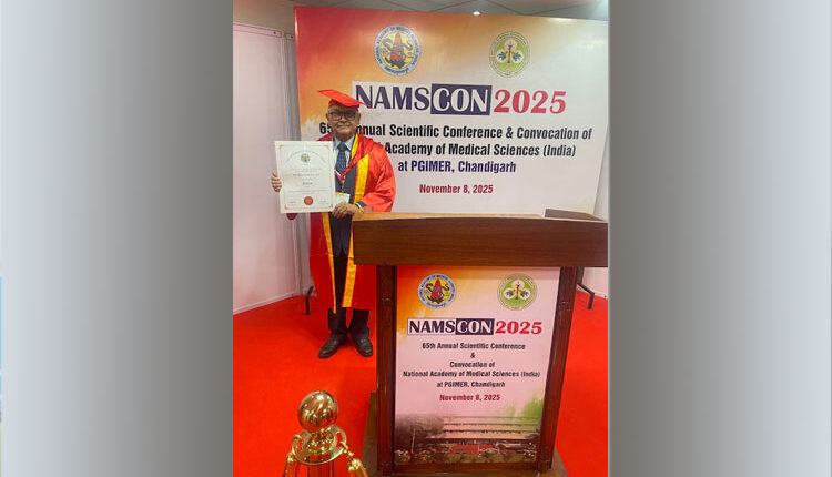 National Academy of Medical Sciences(NAMS)  conferred Emeritus Professor of KIMS Dr. Hemanta Kumar Kar FAMS in Dermatology for the year 2025 on 8th November, 2025. This is the most prestigious honour given to the eminent Scientists of the country in their specific field  every year. Dr. Kar attended the convocation held at PGIMER, Chandigarh on 8th November, 2025 and received the honour from the Haryana Governor, the Chief Guest of the convocation and Prof Paul, Hon’ble member of NITI Udyog, who was the guest of honour. Every year only one of the Dermatologists of the Country  is given this honour. Director of AIIMS, Bhubaneswar Prof. Ashutosh was also honoured with FAMS this year in Medicine.