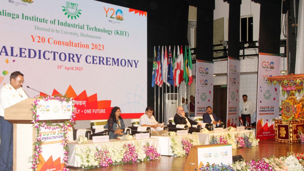 The Youth-20 Consultation, held in KIIT-DU under the aegis of G20, ended on a grand note with powerful speeches from the dignitaries, on 15th April 2023. The valedictory ceremony was graced by Shri Rohit Pujari, Hon’ble Minister of Higher Education, Government of Odisha, Mr. Reuben Gauci, H.E. High Commissioner of Malta, Prof. Sasmita Samanta, Vice Chancellor, KIIT-DU, Prof. J. R. Mohanty, Registrar, and Prof. C. K. Panigrahi, Director, Quality Assurance. Delegates from 20 countries, including Members of Parliament, also graced the event, besides academicians, researchers, scientists, celebrity musicians and students from KIIT and others.