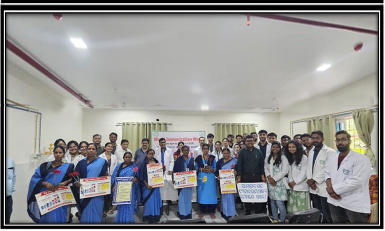 The event was graced by the presence of eminent dignitaries including Prof. (Dr.) C. B. K. Mohanty, Pro VC KIIT; Dr. Ajit Mohanty Director General KIMS; Dr. V. K. Sengupta M/O IC RHTC Kalarabanka; Dr. Sai Chandan Das, Associate Professor of Dept of Community Medicine; and Dr. Alpana Mishra Professor Department of Community Medicine, who chaired the proceedings and addressed the audience on the vital role of vaccines in disease prevention and health promotion.