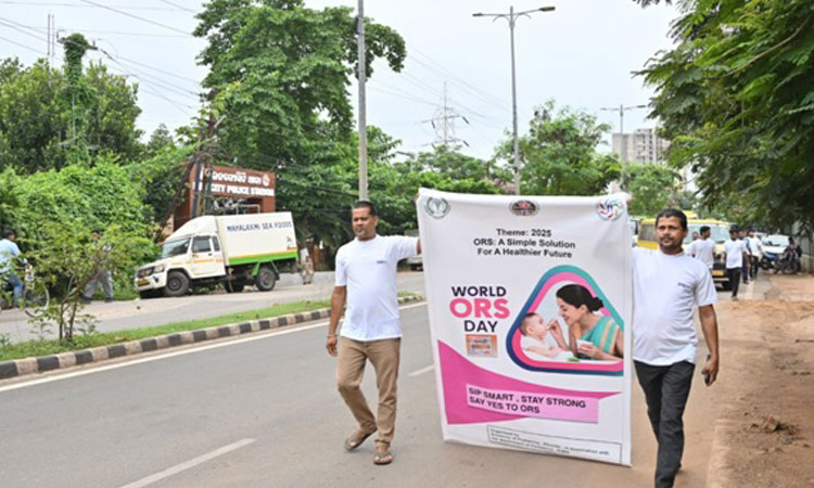 The Academy of Pediatrics, Khurda, in association with the Department of Pediatrics, KIMS, organized World ORS Day with a walkathon from KIMS to Sikharchandi Chhak. The event, themed “ORS: A Simple Solution, A Healthier Future,” witnessed participation from 90 doctors, postgraduates, and health workers. The slogan “SIP SMART, STAY STRONG; SAY YES TO ORS” emphasized ORS as a vital health intervention.