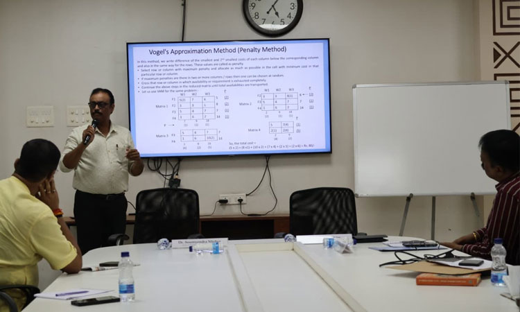 Dr. Soumyendra Mishra explained how mathematics plays a vital role in reducing transportation cost. He explained about the formation of a transportation matrix by different methods like, row minima method, column minima method, matrix minima method, east coast corner method, vogel’s approximation method for finding the basic feasible solution of a transportation problem. Dr. Mishra emphasized how to optimize (maximize or minimize) the basic feasible solution by using UV method and MODI method. The session was followed by a question and answer session.