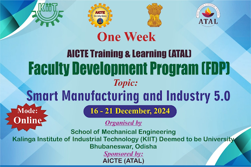 Online Faculty Developed Programme was conducted from 16/12/24 to 21/12/24, by School of Mechanical Engg., KIIT Deemed to be University which was sponsored by AICTE Training and Learning (ATAL). Dr. Smitirupa Pradhan and Dr. Niloptala Bej act as coordinator and Co-cordinator, respectively for this program. This program aims to empower faculty members and researchers with knowledge and skills in cutting-edge areas of Smart manufacturing and Industry 5.0. Smart manufacturing refers to the application of advanced technologies like IoT (Internet of Things), AI (Artificial Intelligence), cloud computing, and big data in the manufacturing sector to optimize processes, improve productivity, and enhance flexibility. Industry 5.0 builds upon Industry 4.0, emphasizing human-centric innovation, environmental sustainability, and resilience in manufacturing processes. It highlights the collaboration between humans and machines rather than the complete automation of tasks. Smart manufacturing prioritizes technological advancements and process efficiency, Industry 5.0 reintroduces the human touch, ensuring a balance between automation and human creativity for a sustainable future. We are focusing on the sub- topics like from Industry 4.0 smart manufacturing to Industry 5.0, role of process Automation in Industry 4.0/5.0, role of Industry 4.0 in smart manufacturing, factory automation, use of AI in Industry 5.0 and requirements additive manufacturing in